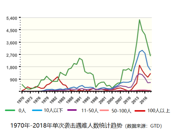 随着全球化的发展以及新旧世界政治格局的转换,地区政治动荡和宗教极端势力抬头,恐怖主义活动愈发猖獗,恐怖主义已经成为当今人类社会的公敌。据全球恐怖主义数据库(GTD,Globe Terrorism Database)统计,1970年—2018年期间,全球共发生各类恐怖主义袭击191464起,其中一次恐怖袭击造成10人以上遇难的就有近4万起。 如何防范恐怖主义已经成为世界各国共同面对的一个非传统安全课题。