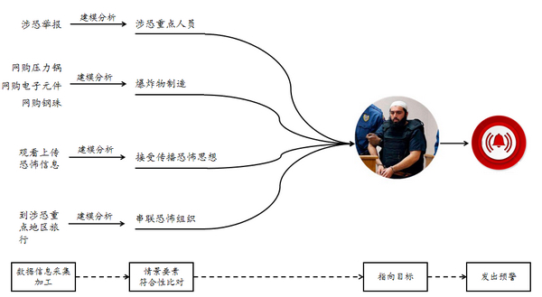 恐怖袭击制造者艾哈迈德·汗·拉哈米被举报是恐怖分子,通过定性建模可以打上涉恐标签;经常在互联网浏览恐怖内容并在公共社交媒体账户上传相关圣战视频,多次前往中亚的恐怖组织活动地区,这些数据信息可以通过定量基础上的定性分析打上涉恐标签;购买压力锅、电路板、电子点火器和钢珠等可能用于制造爆炸物的原材料,通过逻辑关联分析可知可能与爆炸物制造相关联。根据自制爆炸物大数据统计分析经验,压力锅是高使用率的爆炸物制作原材料,在数据建模时尤其应该重点标记关注,提高该指征数据在建模中的重要性,通过建模分析得出有制造爆炸物的可能,可以打上涉恐标签。以上每一条线索都可以看作是一个或几个数据建模的分析结论,但是如果孤立看待每一个事件,可能都不足以和爆炸案关联起来或者关联强度不足,但是如果将多个事件综合在一起,就会勾勒出一个爆炸案的情景,形成一个爆炸案的大数据画像。