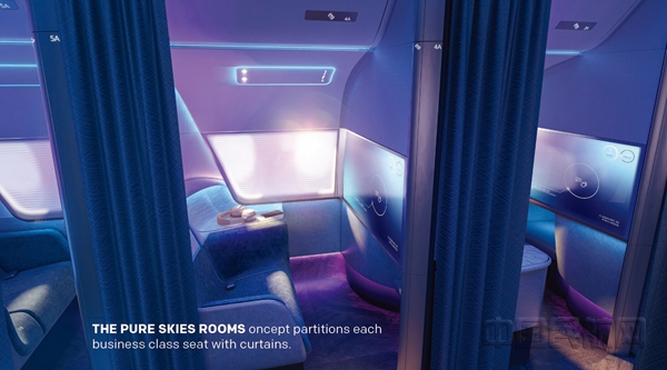 “纯净天空”设计方案的一个核心理念是将当前按照“等级”划分客舱区域的概念,转化成经济舱用“纯净天空区”来代替,公务舱改称为“纯净天空室”。