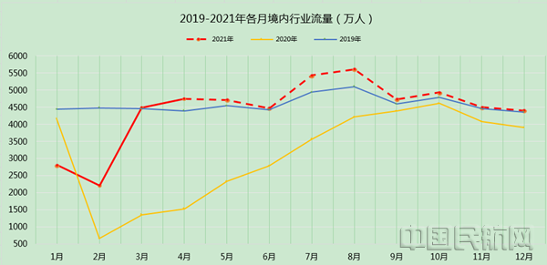 根据我们的定性和定量分析认为,5-12月,我国超大规模市场的巨大优势将持续发挥重要作用,推动境内市场需求超过2019年同期水平,但一些有利条件也将发生变化,最终使市场进入传统的周期性波动趋势。预计2021年全年境内行业旅客运输量约为2019年的95%左右。具体走势如下图。