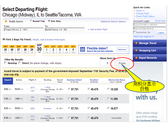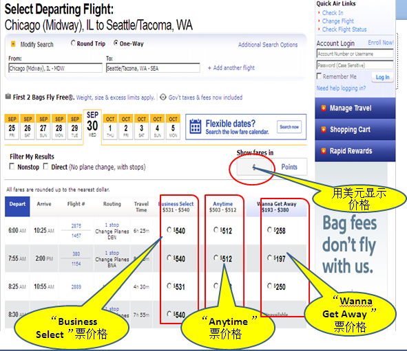 在西南航空公司官网查询机票可以显示用美元表示的价格与用积分表示的价格。2015年8月我们在西南航空官公司网查询了9月30日从芝加哥到西雅图的航班信息,图1和图2分别是用美元和积分表示的部分航班的价格。