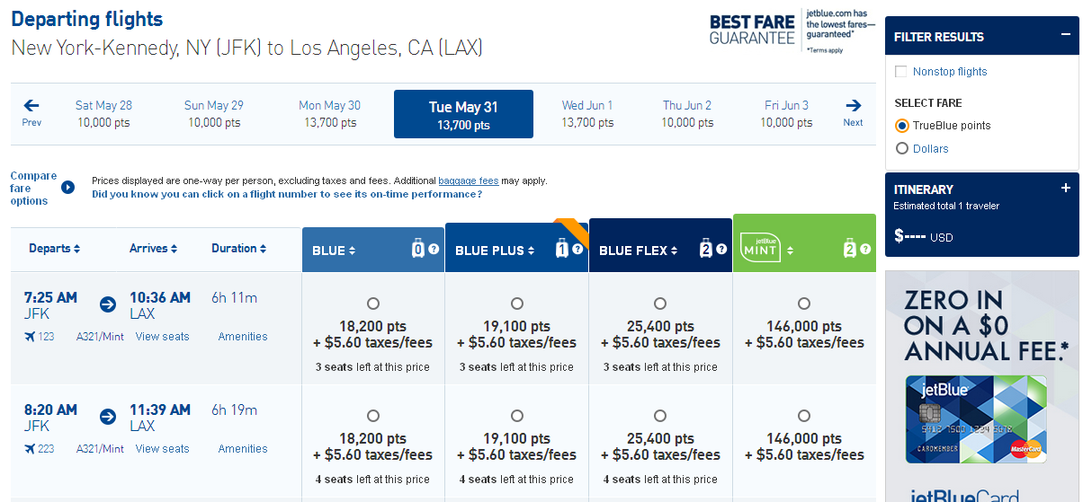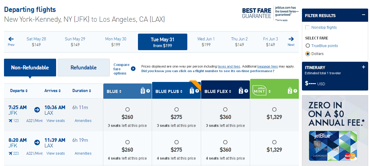 为了计算捷蓝航空常旅客积分与货币之间的换算关系,我们2016年5月12日在捷蓝航空官网上查询了2016年5月31日纽约至洛杉矶的单程机票信息,图4是用美元显示的价格,图5是用积分显示的价格。通过对这些数据的计算分析可知,用积分购买BLUE、BULE PLUS和BULE FLEX机票时,大约65个积分相当于1美元,用积分购买MINT机票时,大约105个积分相当于1美元。