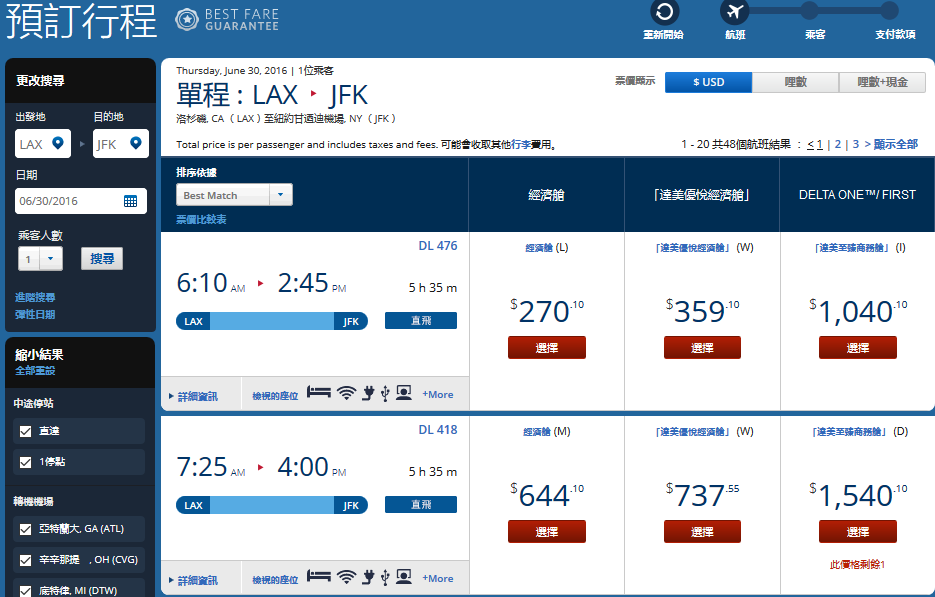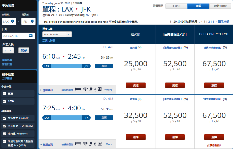 达美、达美快线(Delta Shuttle)或达美联营航空编号的航班符合累积资格之公开票价付费舱等 |