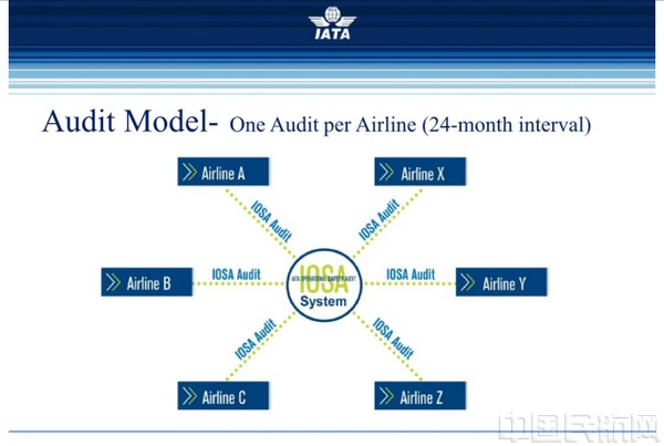 每次由航空公司和IATA协商确定一家Audit Organization审计机构,由5名行业专家组成的审计团队会在大约一周的时间内,对航空公司组织管理ORG、飞行运行FLT、运行控制DSP、机务维修MNT、客舱运行CAB、地面操作GRH、货物运行CGO、安保管理SEC共8个运行系统进行全面的检查,通过标准和建议措施ISARPs,对航空公司的受控文件Documentation以及执行度Implementation的落实情况进行审计。