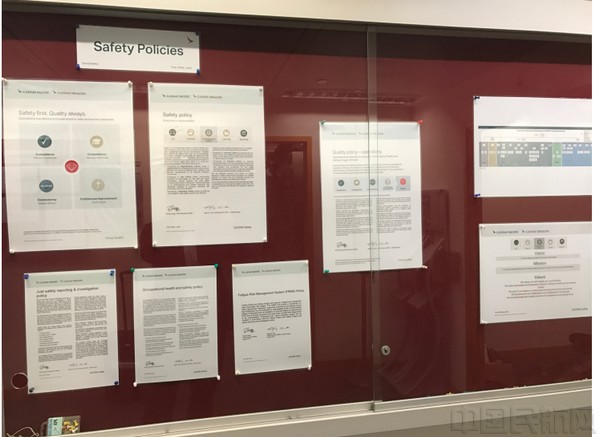 说明:此条款中对于公司安全政策需要以清晰、明确公开的方式在公司进行宣传。而国内航空公司对于安全政策宣传的普遍做法是张贴各类口号:如“安全生产月”,“严禁违章违规”、“五违六必治”、“抓重点 抓关键 抓薄弱环节”、“在岗一分钟 安全六十秒”等等、 而非公司具体实际的安全政策。 安全政策需要明确责权利和期望,同时每一段时间需要由高层的进行参与修订,作为政策本身应该是可以被分享和记录的,从而体现安全是组织的核心价值观念。