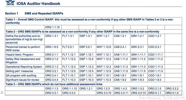《IOSA Audit Handbook Interlinked and Repeated ISARPs》是一本专门描述相关和重复审计条款的手册。其基本准则就是:在其他专业有多个(大于等于2个)不符合项那么相关的ORG条款就判定为不符合。而SMS相应条款(所有ISARPs后面有SMS符号的) 之间会有关联,比如不同部门对于是否承运supernumeraries随机人员这个判定是否适用,会导致条款的符合性存在偏差。所以建议航空公司建立有相关性的Excel表格,以方便关联统计。