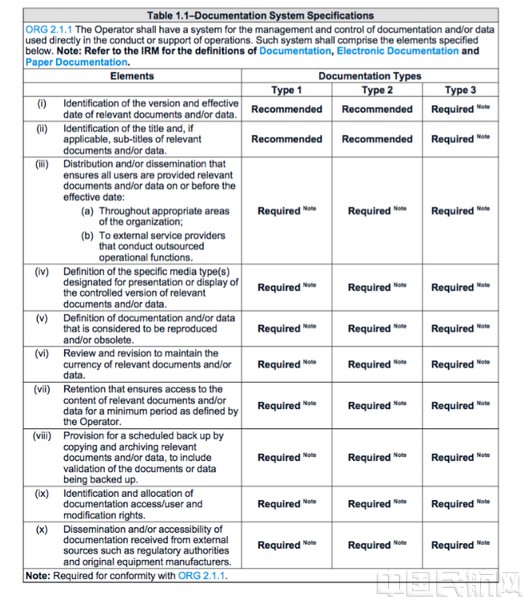 ORG 2.1.1 The Operator shall have a system for the management and control of documentation and/or data used directly in the conduct or support of operations. Such system shall comprise the elements specified in Table 1.1. (GM)