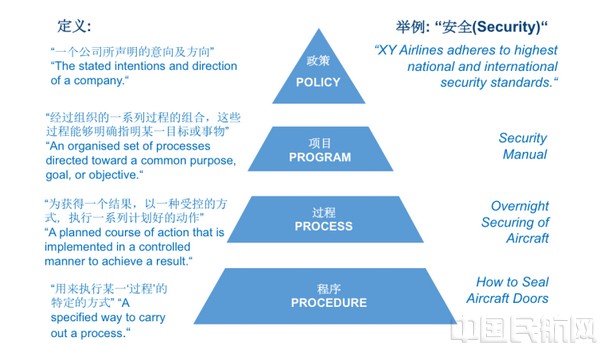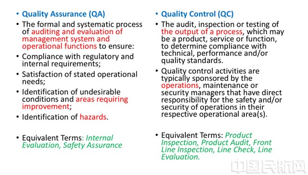 QA和QC的区别:和国外大多航企在审计过程中主要涉及安全经理、训练经理、质量管理经理,以及相对扁平化的管理体系所不同。国内航企对于这两个QA、QC职位的专设经理相对较少,通常都由安监部门、运管部门的科室承担相应的职责。不少ISARPs涉及到质量保证Quality Assurance和质量控制Quality Control。其实这两者也是互相依存,息息相关的。内审多用QA表述,事前管理,根据规章发觉问题、解决问题,特别是危险源的识别 ,由公司系统性的组织实施。QC更多的是对已经完成的产品进行校验,如航线检查,多由所属运行部门进行组织。外包的服务通常需要Quality Control。