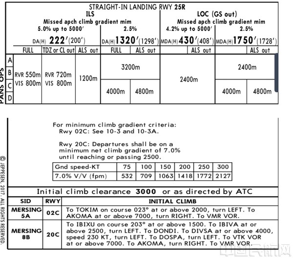 说明:此条款中主要涉及的ISM11版飞行第四部分设备性能章节有了较大的改变,很多条款都合并分类了,但对于飞机双发爬升性能这个条款依然保留。国内外航图中对于起飞离场阶段、复飞的爬升性能都有相应的要求(图例香港机场的进近图和新加坡机场的离场图),作为机组人员在选择离场方式以及进近决断高度时需要有对应的手册依据。需要区分的是,这里的双发爬升性能指的是离场阶段不同外界条件下的飞机双发爬升性能,并不是指机组平日里查阅的起飞性能分析。